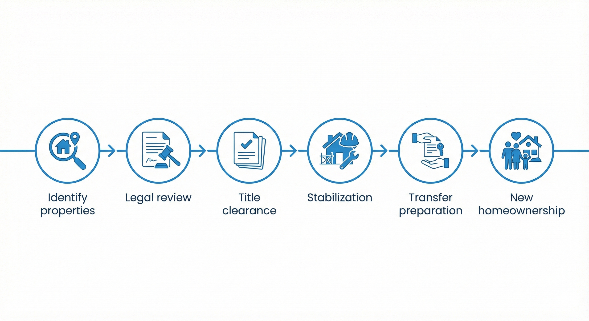 It means a property has been identified, reviewed, and entered into the Land Bank’s acquisition pipeline. Properties may still require legal work, title clearance, or stabilization before they are ready for transfer.