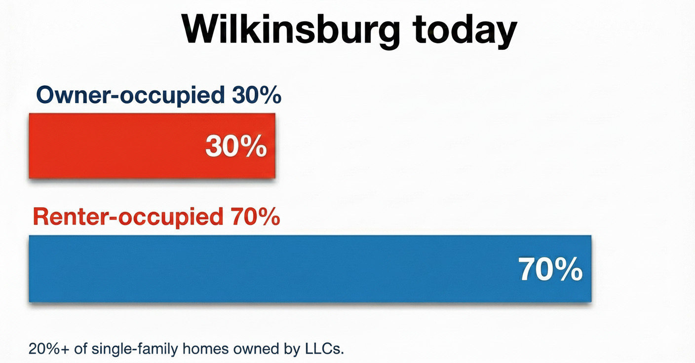 When investors capture distressed properties at scale—92% through sheriff’s sale go to LLCs—owner-occupancy falls and neighborhoods hollow out. Wilkinsburg is now 4th in Allegheny County for LLC-owned homes.